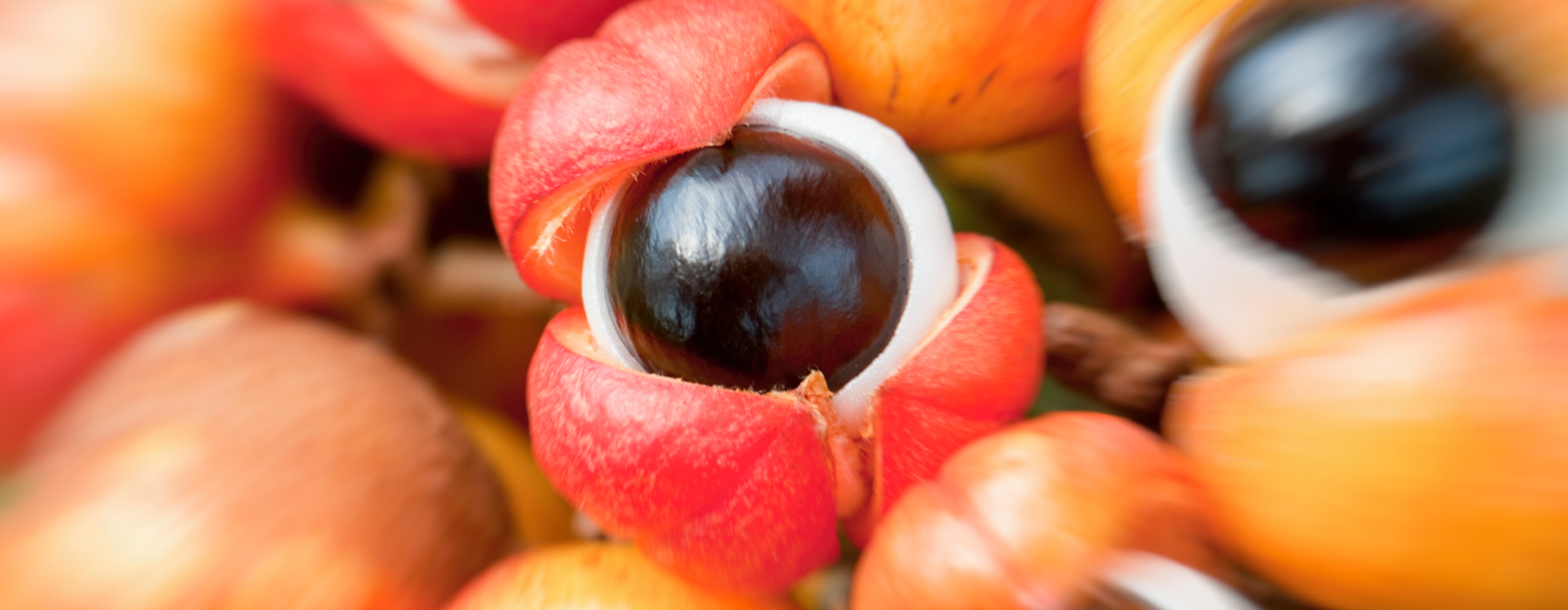 A guarana piros termése a felnyíló fehér magköpennyel és a fekete maggal távolról egy szemet idéz. Brazíliában a guarana üdítő szinte nemzeti ital, enyhén karamellás jegyekkel. A magból hagyományosan szárított rudakat készítettek, amelyekből vízbe reszeltek, és így itták meg a házi frissítőt.